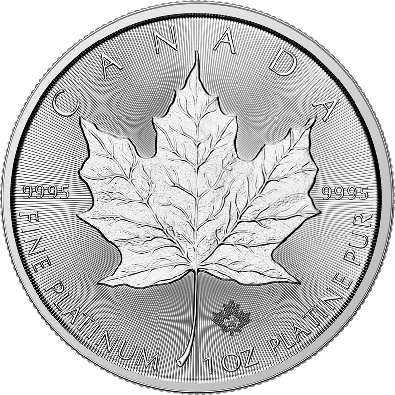 На реверсе изображение кленового листа работы Уолтера Отта (Walter Ott). Слева и справа от листа надпись: 9995 (проба платины). Вдоль канта надпись: FINE PLATINUM 1OZ PLATINE PUR (вес платины). Внизу, справа от стебля лазерная гравировка: 25 (год чеканки).