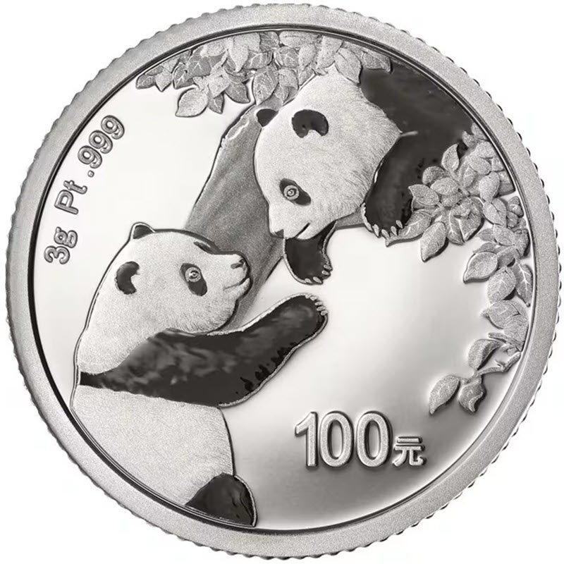 На реверсе изображены две маленькие панды, играющие на дереве. Над ними листья. Слева вверху надпись 3g Pt .999 (вес и проба платины), справа внизу: 100 元 (номинал).