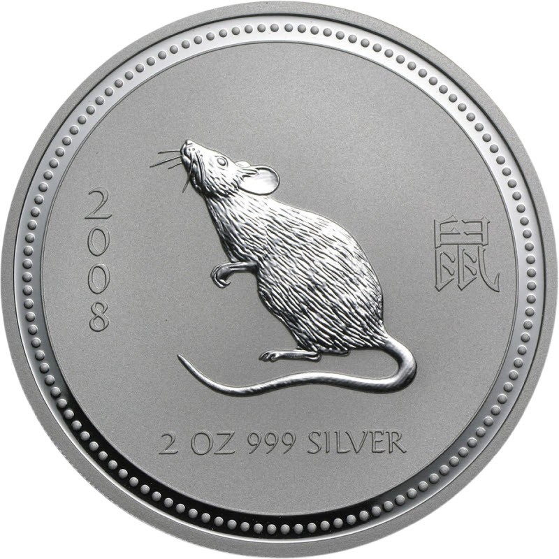 На реверсе изображена стоящая крыса. Слева: 2008 (год Крысы), справа иероглиф: 鼠 (Крыса), внизу: 2 OZ 999 SILVER (вес и проба серебра).