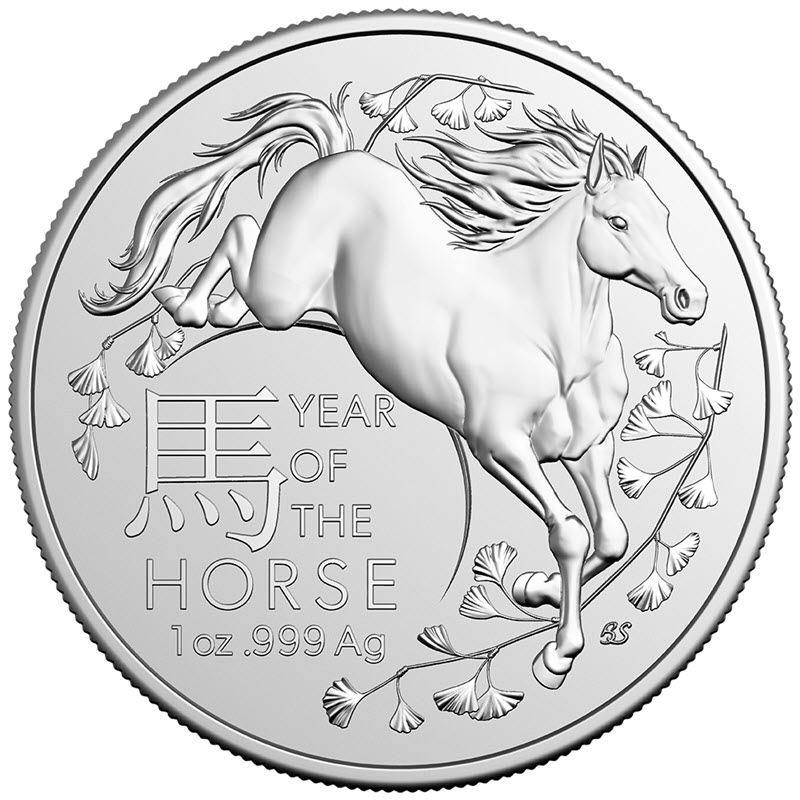 На реверсе изображена скачущая лошадь. Слева внизу надпись: 馬 YEAR OF THE HORSE 1 oz .999 Ag (год Лошади, вес и проба серебра).  Внизу справа инициалы дизайнера: BS (Bronwyn Scott).