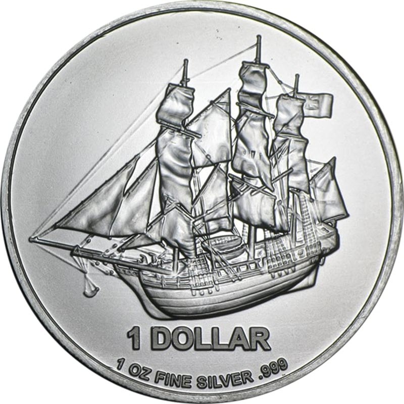На реверсе изображён парусный корабль «Баунти». Под ним надпись: 1 DOLLAR 1 OZ FINE SILVER .999 (номинал, вес и проба серебра).