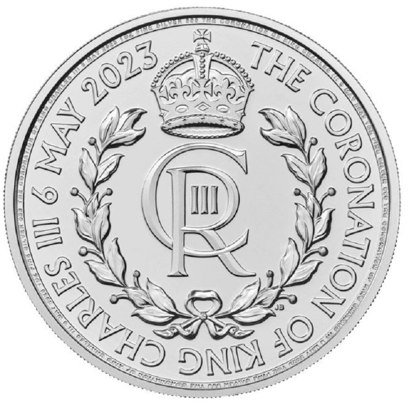 Королевский вензель короля Карла III расположен на видном месте в центре лаврового венка, а на реверсе надпись "THE CORONATION OF KING CHARLES III 6 MAY 2023" («КОРОНАЦИЯ КОРОЛЯ КАРЛА III 6 МАЯ 2023 ГОДА»). Шифр представляет собой стилизованную интерпретацию Короны Тюдоров, парящей над переплетенными буквами «C», «III» и «R». Надписи символизируют имя монарха «Карл III» и «Рекс», что в переводе с латыни означает «король». Дополнительная строка крошечного повторяющегося текста с надписью "THE CORONATION OF KING CHARLES III," "6 MAY 2023" и "1 OZ FINE SILVER 999" («КОРОНАЦИЯ КОРОЛЯ КАРЛА III», «6 МАЯ 2023 ГОДА» и «1 УНЦИЯ ЧИСТОГО СЕРЕБРА 999») окружает весь дизайн, прилегающий к ободу монеты. Дизайн реверса принадлежит известному британскому дизайнеру монет Джону Бергдалу.