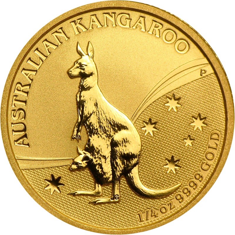 На реверсе изображен кенгуру с детенышем. На левой лапе кенгуру инициалы дизайнера Джастина Грэма (JG, Justin Graham). Слева от кенгуру семиконечная звезда, справа созвездие Южного Креста. Выше и правее монограмма Пертского монетного двора Р. Вверху вдоль канта надпись: AUSTRALIAN KANGAROO (Австралийский кенгуру), внизу: 1/4 oz 9999 GOLD (вес и проба золота).