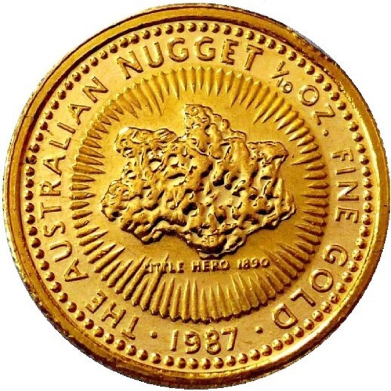 На реверсе изображен самородок «Маленький Герой». В нижней части самородка инициалы дизайнера: SD (Stuart Devlin). Под самородком надпись: LITTLE HERO 1890 (самородок, дата находки). Вдоль канта надпись: THE AUSTRALIAN NUGGET 1/10 OZ. FINE GOLD · 1987 · (серия, вес и проба золота, год чеканки).