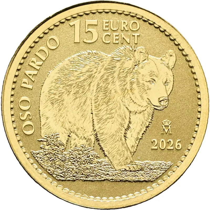 На реверсе изображен идущий бурый медведь. Справа от него: М 2026 (монограмма Королевского монетного двора Испании, год чеканки). Вдоль канта надпись: OSO PARDO 15 EURO CENT (бурый медведь, номинал).