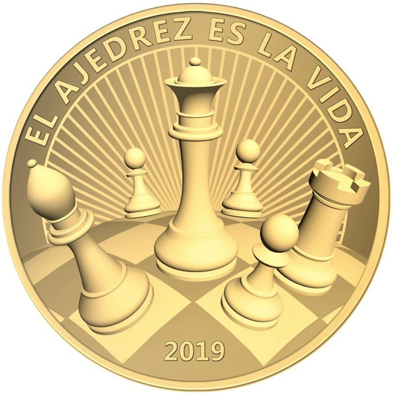 На реверсе золотой монеты «Шахматы» — изображение шахматной доски-земного шара, шахматных фигур. Сверху надпись на испанском языке «EL AJEDREZ ES LA VIDA» — «Шахматы — это жизнь». Внизу — год выпуска золотой монеты (2019).