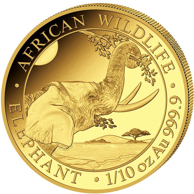 Золотая монета Сомали - Слон 2023 года выпуска весом 1/10 тройской унции (3.11 г). Данная монета выпускается в рамках серии "Африканская дикая природа".