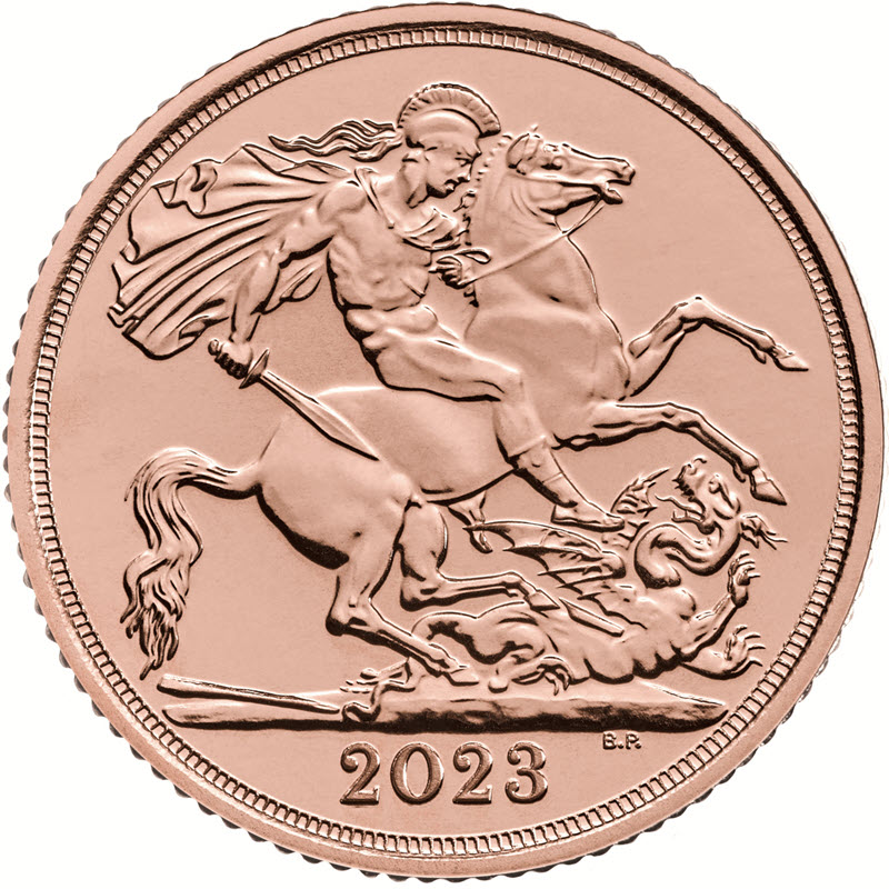 На реверсе классическое изображение Святого Георгия и дракона от Бенедетто Пиструччи. Внизу справа инициалы дизайнера B.P. (Benedetto Pistrucci), ниже: 2023 (год чеканки).