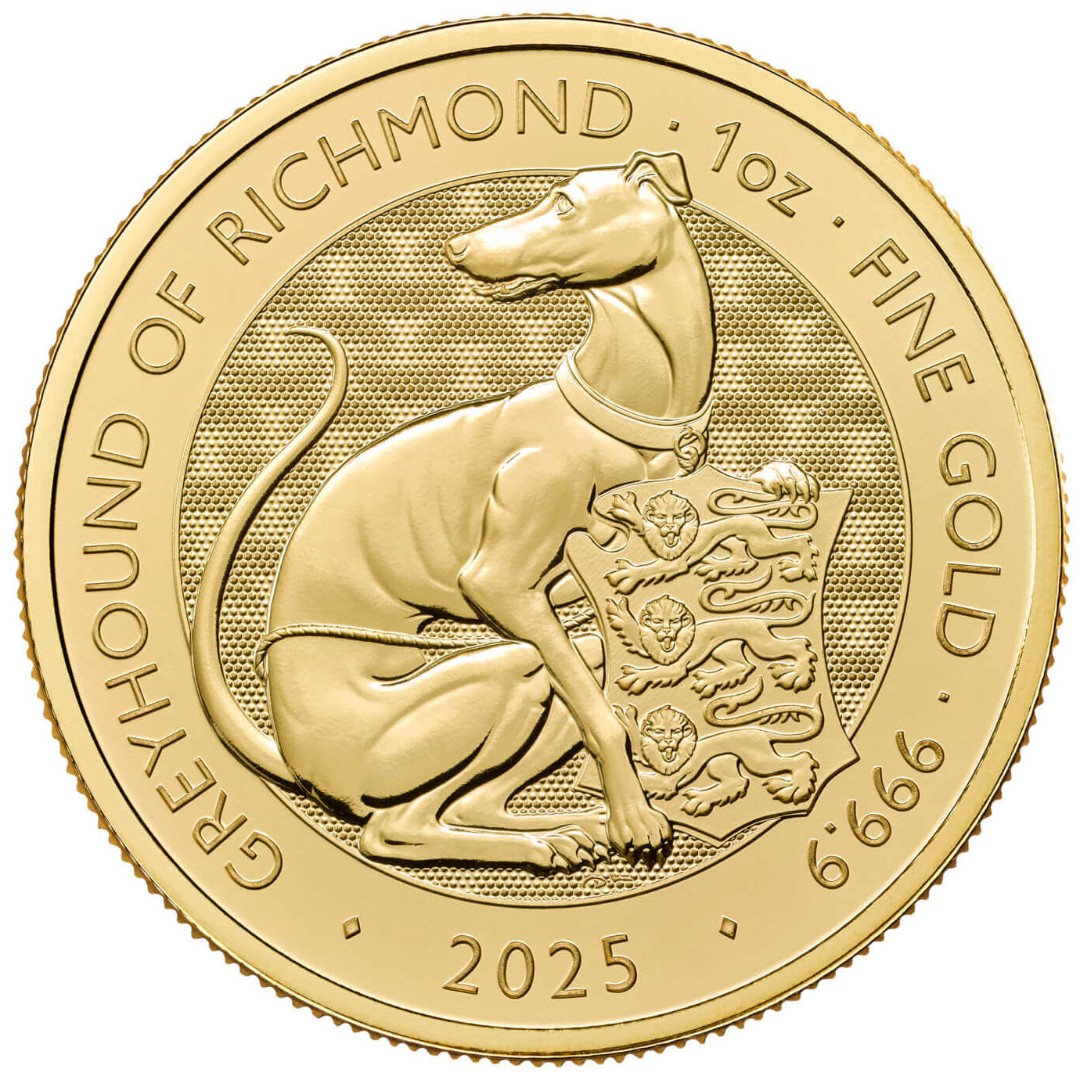 На реверсе изображена сидящая борзая, положившая лапу на щит с тремя львами Англии. У щита в верхнем углу выемка, куда упиралось копьё для атаки в рыцарских турнирах. Вдоль канта надпись: GREYHOUND OF RICHMOND · 1 oz · FINE GOLD · 999.9 · 2025 · (Грейхаунд Ричмонда, вес и проба золота, год чеканки). Внизу над датой инициалы дизайнера D.L (David Lawrence).