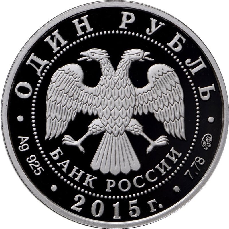 На аверсе изображена эмблема Банка России (двуглавый орел с опущенными крыльями), под ним надпись: БАНК РОССИИ. Вдоль канта надпись: ОДИН РУБЛЬ • Ag 925 • 2015 г. • 7,78 ММД • (номинал, вес и проба серебра, год чеканки, монограмма Московского монетного двора).