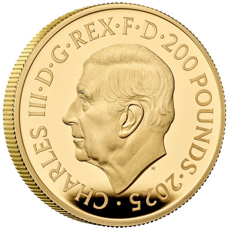 На аверсе изображен Его величество Король Чарльз III. Внизу портрета инициалы дизайнера MJ (Martin Jennings). Вдоль канта надпись: CHARLES III·D·G·REX·F·D·200 POUNDS·2025 · (Чарльз III, божьей милостью, король, защитник веры, номинал, год чеканки).
