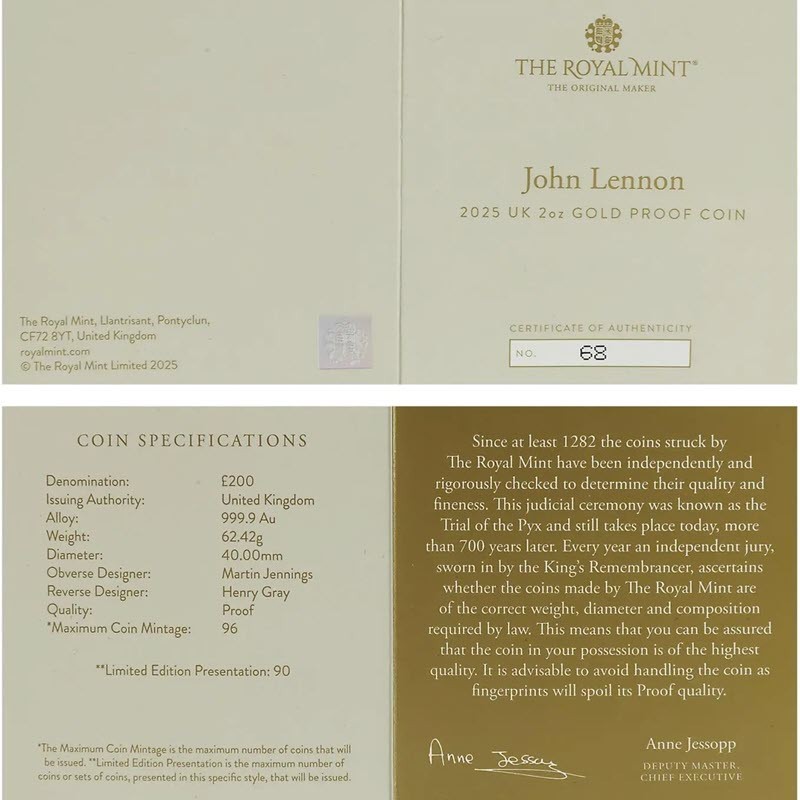 Золотая монета Великобритании "Легенды музыки. Джон Леннон" 2025 г.в. (пруф), 62.2 г чистого золота (проба 9999)