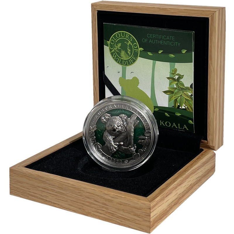 На этой красивой серебряной монете весом 3 унции изображено самое известное животное Австралии, входящее в серию "Цвета дикой природы" - коала. Монета имеет блестящую зеленую эмаль, с антикварным качеством отделки и очень высоким рельефом животного. Она поставляется в коробке вместе с сертификатом подлинности. Ограниченная серия из 999 экземпляров по всему миру.