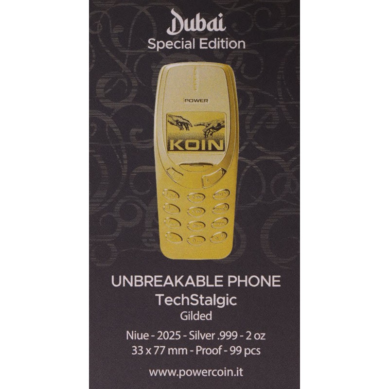 На аверсе обратная сторона телефона изображена без крышки аккумуляторного отсека, открывая печатную плату и компоненты. В верхней части неофициальная «Государственная печать Ниуэ». Над печатью надпись: TECHSTALGIC (серия), слева: 2 Oz SILVER .999 MINTAGE 499 (вес и проба серебра, тираж), внизу: 2 DOLLARS NIUE ISLAND 2025 (номинал, страна-эмитент, год чеканки).