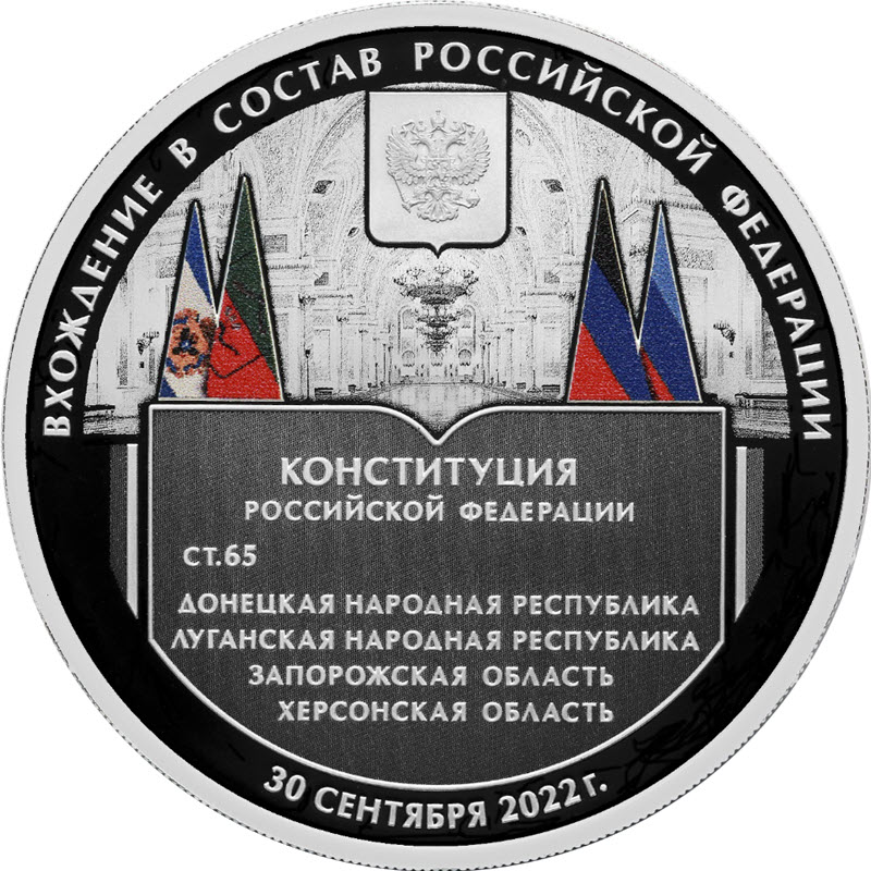 На реверсе стилизованное изображение Конституции Российской Федерации, раскрытой на статье 65 на фоне Георгиевского зала Большого Кремлевского дворца. Вверху герб Российской Федерации и флаги в цвете Донецкой Народной Республики, Луганской Народной Республики, Запорожской и Херсонской областей. Изображения Конституции и зала выполнены в технике лазерного матирования. Вверху вдоль канта надпись: ВХОЖДЕНИЕ В СОСТАВ РОССИЙСКОЙ ФЕДЕРАЦИИ, внизу: 30 СЕНТЯБРЯ 2022 г.