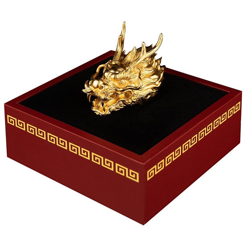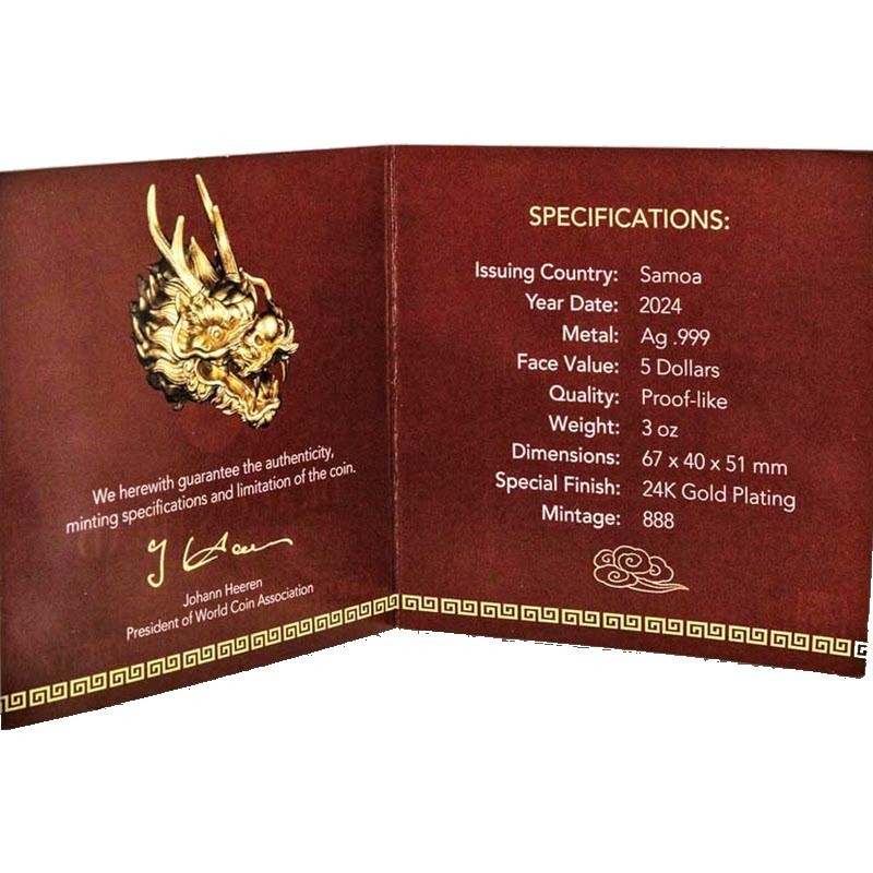 Эта потрясающая серебряная монета весом в 3 унции посвящена главному зодиакальному животному 2024 года — Дракону. В китайской мифологии дракон является важнейшим символом власти и признан Высшим Существом среди всех существ. У монеты сложный 3D – дизайн, она имеет размеры 67 х 40 х 51 мм и золотое покрытие в 24К. Поставляется в оригинальном футляре с сертификатом подлинности. Тираж: 888 штук.