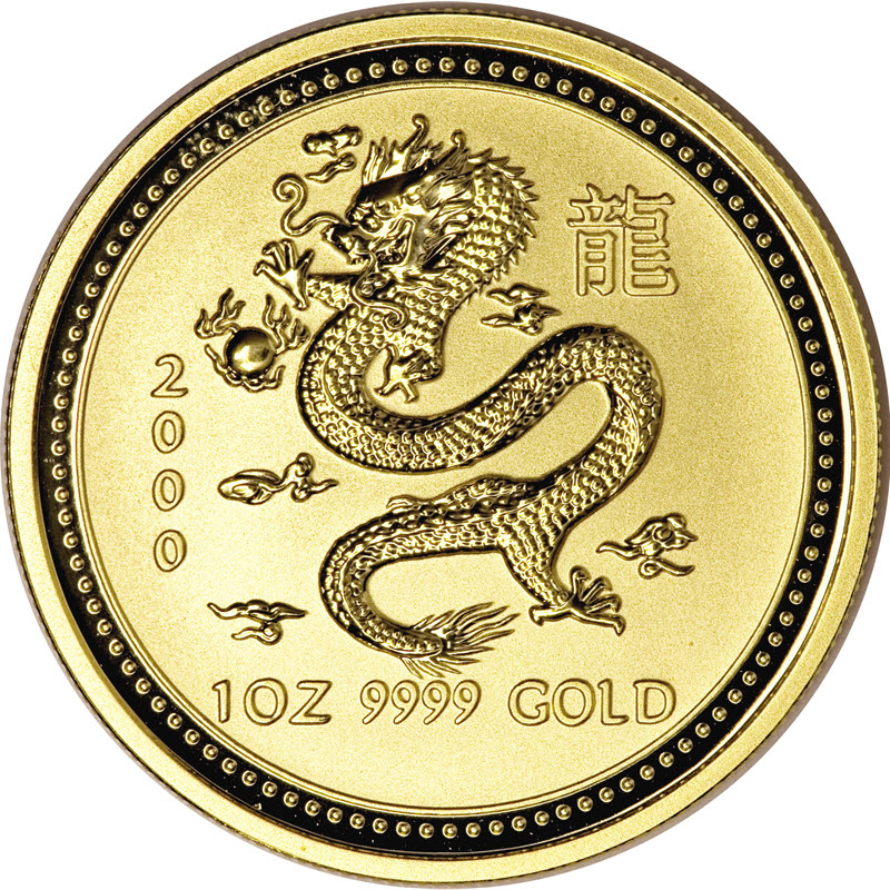 Классической изображение китайского дракона, преследующего пылающую жемчужину. Слева в столбик указан год выпуска — «2000», справа китайский иероглиф, обозначающий дракона. Внизу указаны вес и чистота металла — «1 oz 9999 GOLD».