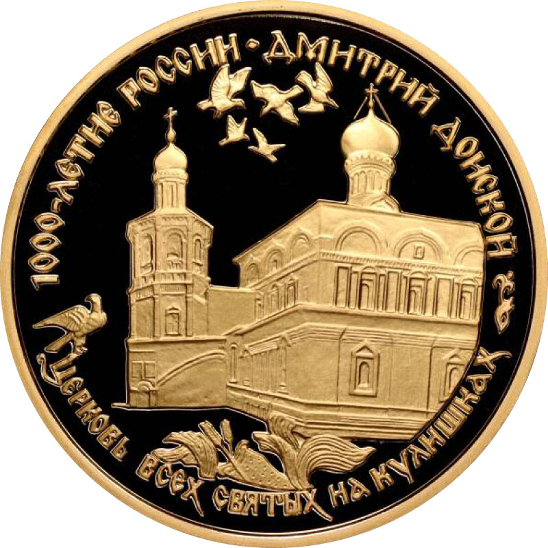 На реверсе золотой монеты - изображение церкви всех святых на Кулишках. По ободу монеты надписи: "1000-летие России. Дмитрий Донской. Церковь всех святых на Кулишках"