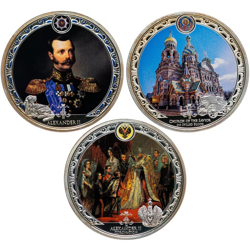 Этот чудесный набор из трех серебряных монет посвящен императору Александру II. Поставляется в оригинальном футляре с сертификатом подлинности. Тираж: 8 000 штук.