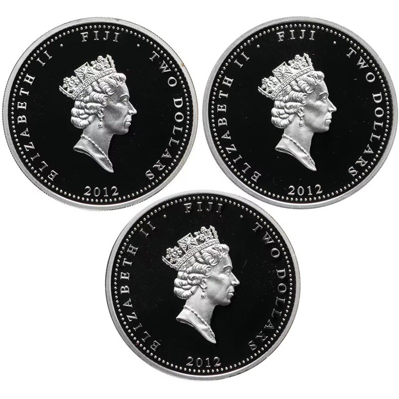 На аверсе каждой монеты изображена королева Елизаветы II с бриллиантовой диадемой и жемчужным ожерельем работы Рафаэля Дэвида Маклауфа (Raphael David Maklouf ). Вокруг портрета надпись: ELIZABETH II · Fiji · TWO DOLLARS 2012 (Елизавета II, страна-эмитент, номинал, год чеканки).