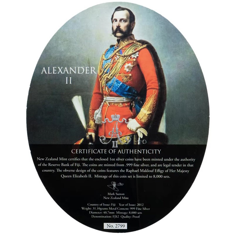 Набор из 3-х серебряных монет Фиджи "Александр II. Корона" 2012 г.в., 3*31.1 г чистого серебра (проба 999)