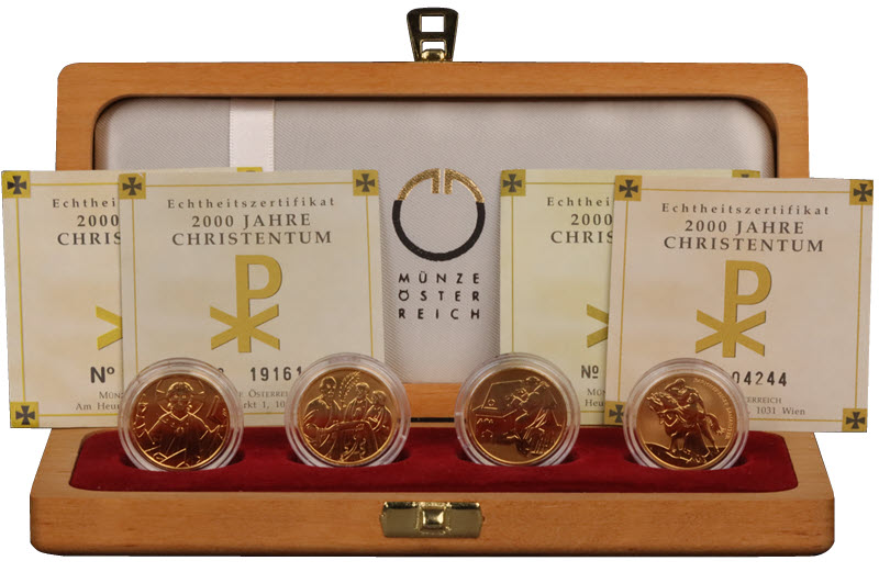 Монетный двор Австрии выпустил четыре  монеты из серии «Рождество Христово», посвященные 2000-летию христианства. Монеты весом 10 грамм 986-й пробы качества пруф, диаметр 22 мм. Набор поставляется в деревянном футляре с сертификатами подлинности. Тираж: 50000 штук.