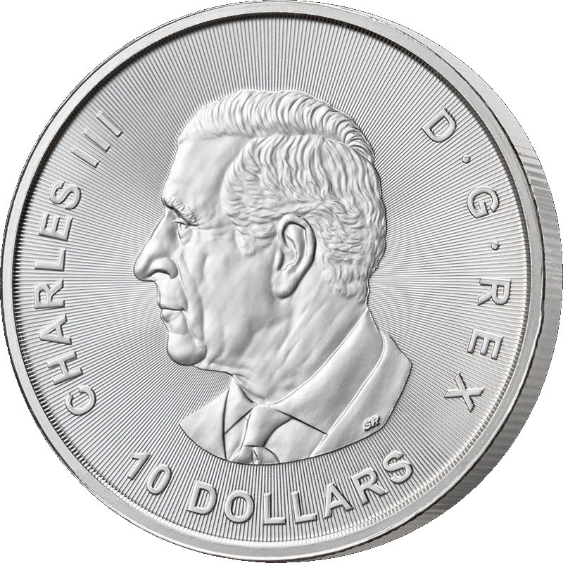 На аверсе монеты 2024 года изображен Его величество Король Чарльз III. На воротнике инициалы дизайнера SR (Steven Rosati). Вдоль канта надпись: CHARLES III D ∙ G ∙ REX 10 DOLLARS (Чарльз III Божьей Милостью Король, номинал).