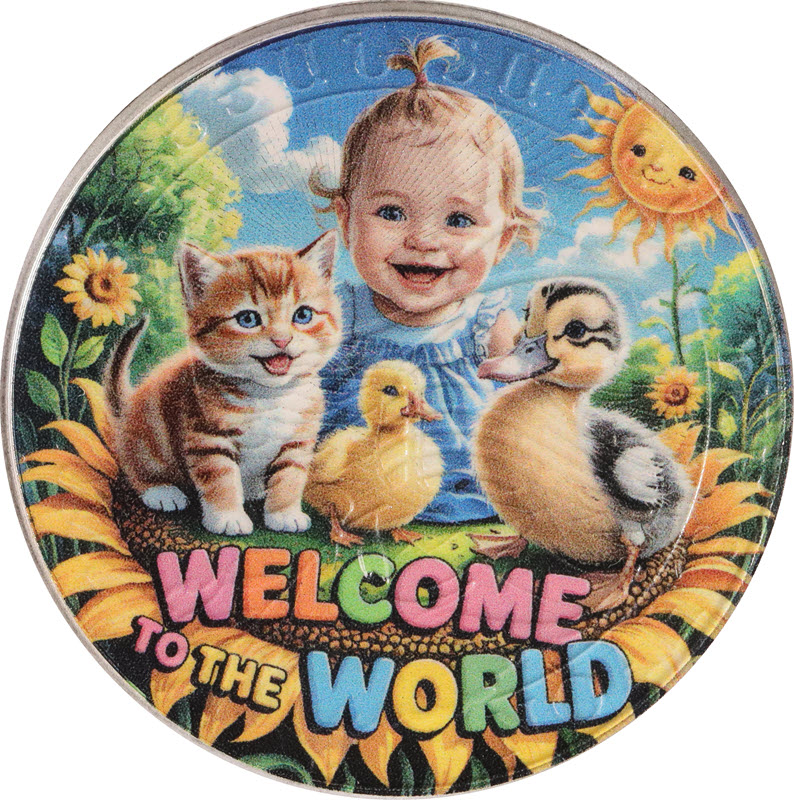 Эта монета создана, чтобы навсегда сохранить эмоции первых дней жизни девочки. Нежная палитра, солнечный пейзаж, котёнок и утята создают атмосферу заботы и домашнего тепла. Надпись WELCOME TO THE WORLD звучит как первое поздравление, которое останется актуальным на долгие годы.