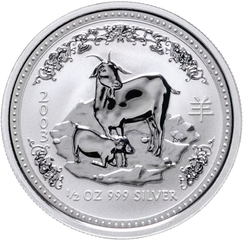 На реверсе изображен символ 2003 года – коза с козленком на гористом фоне, справа иероглиф, слева год выпуска 2003, внизу 1/2 OZ 999 SILVER, (1/2 тройской унции серебра 999 пробы).