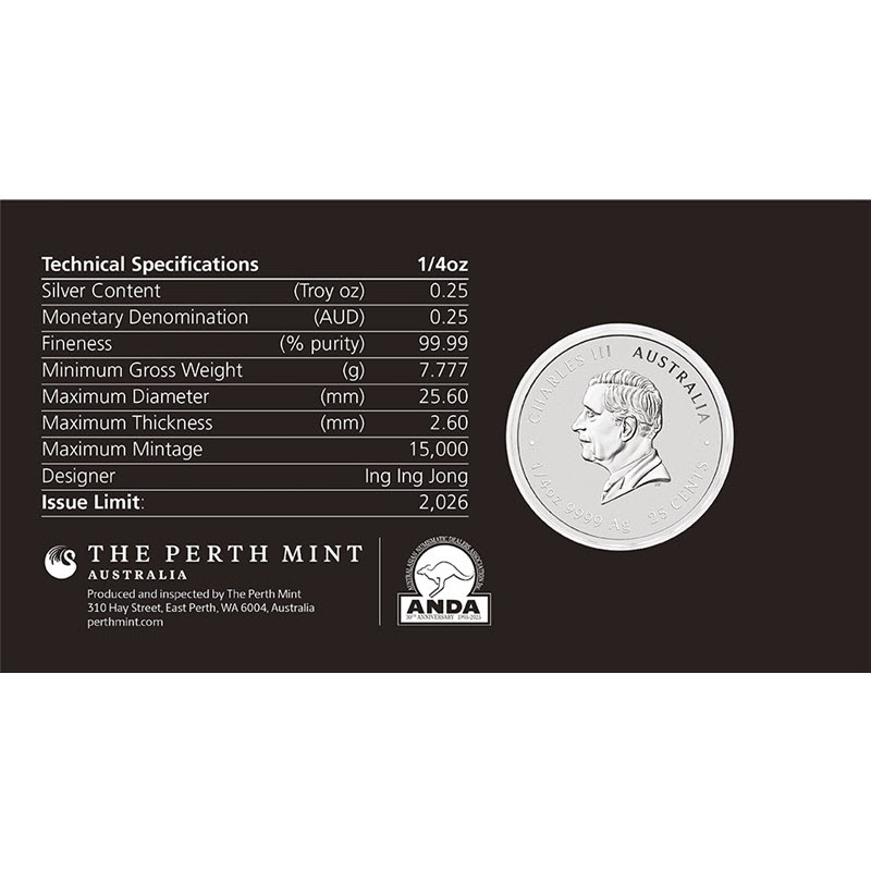 На аверсе изображен Его Величество король Чарльз III. Внизу портрета инициалы дизайнера TD (Dan Thorne). Вдоль канта надпись: CHARLES III AUSTRALIA · 1/4oz 9999 Ag 25 CENTS · (Чарльз III, страна-эмитент, вес и проба серебра, номинал).