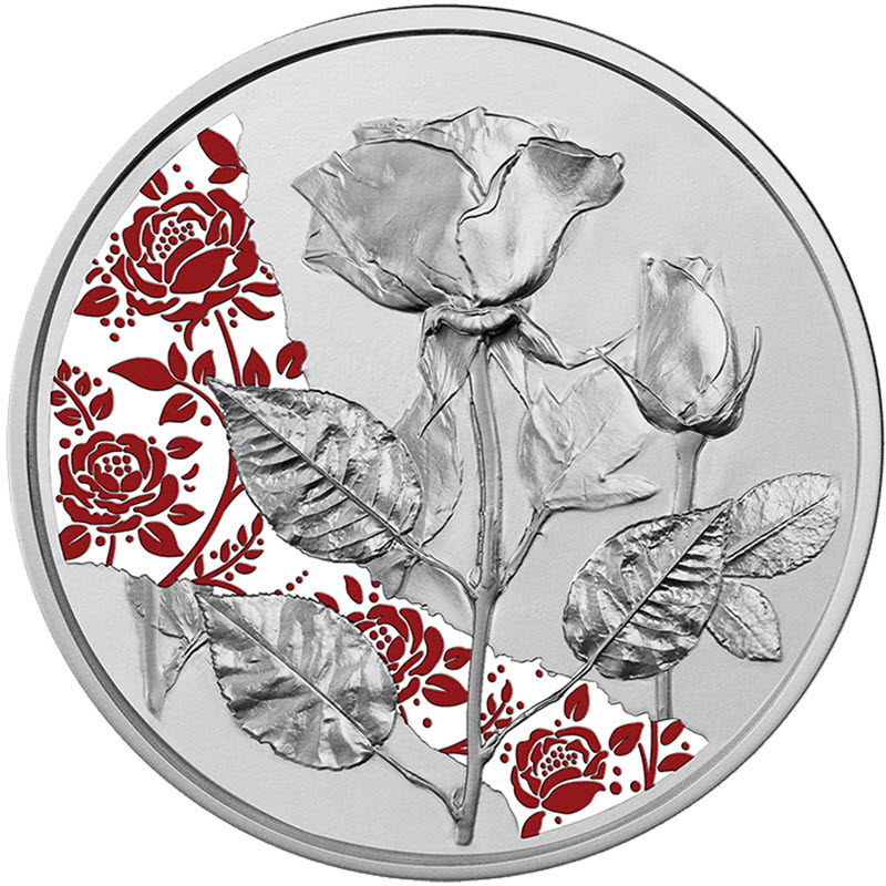 На реверсе монеты изображены две розы на длинных стеблях. Они наложены на узор роз в красном цвете.