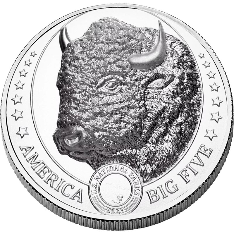 На реверсе изображена голова бизона. Вокруг стилизованный узор из звездочек и надпись: AMERICA BIG FIVE U.S. NATIONAL PARKS 2023 (серия, национальные парки США, год чеканки).