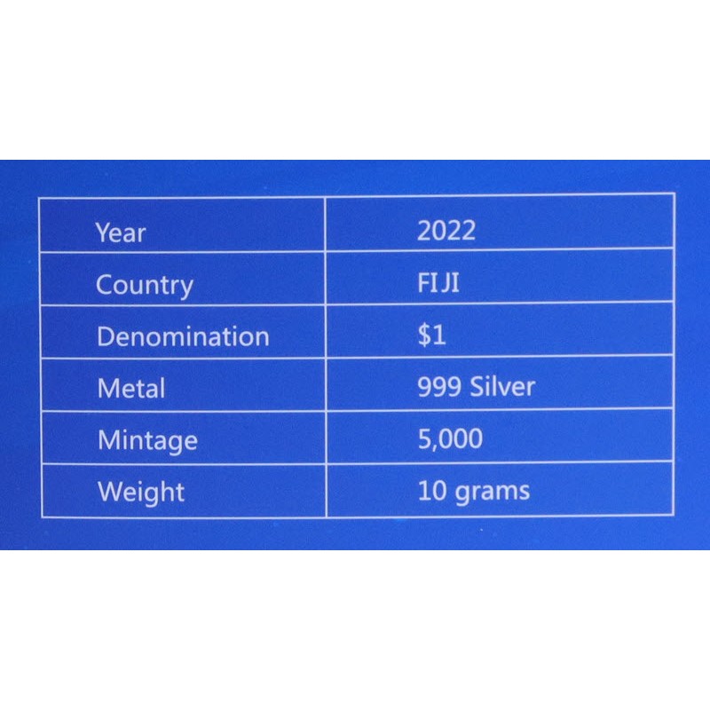 В центре - изображение герба Фиджи: геральдический щит, который с двух сторон держат два фиджийских воина, одетые в традиционные юбки из тапы. Левый воин держит копье, правый — дубину-тотокиа. Над щитом расположено изображение традиционного фиджийского каноэ-такиа с парусом. Под щитом на ленте надпись: Rerevaka na Kalou ka doka na Tui (Бойся Бога и почитай Короля). Под гербом надписи: 1 DOLLAR FIJI 2022 Ag 999 10g (номинал, страна-эмитент, год чеканки, вес и проба серебра).