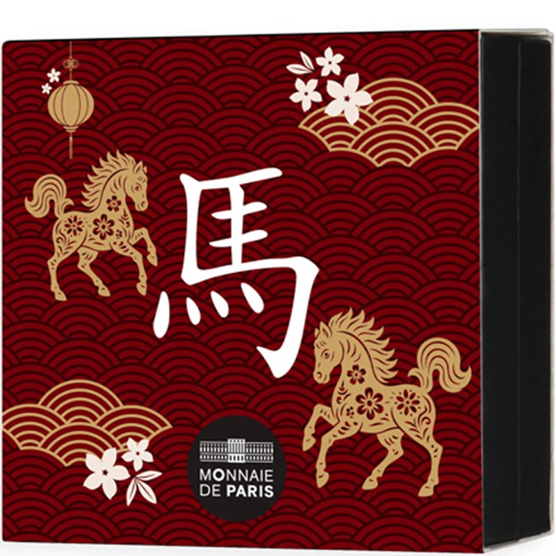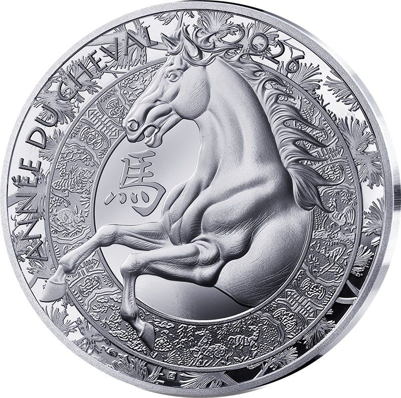 На реверсе изображена Лошадь внутри кольца с китайскими мотивами. Под головой Лошади китайский иероглиф: 馬. Слева вдоль канта надпись: ANNÉE DU CHEVAL 2026 (Год Лошади). Слева внизу Рог изобилия (монограмма Парижского монетного двора) и инициалы дизайнера JJ (Joaquin Jimenez) – два квадрата.