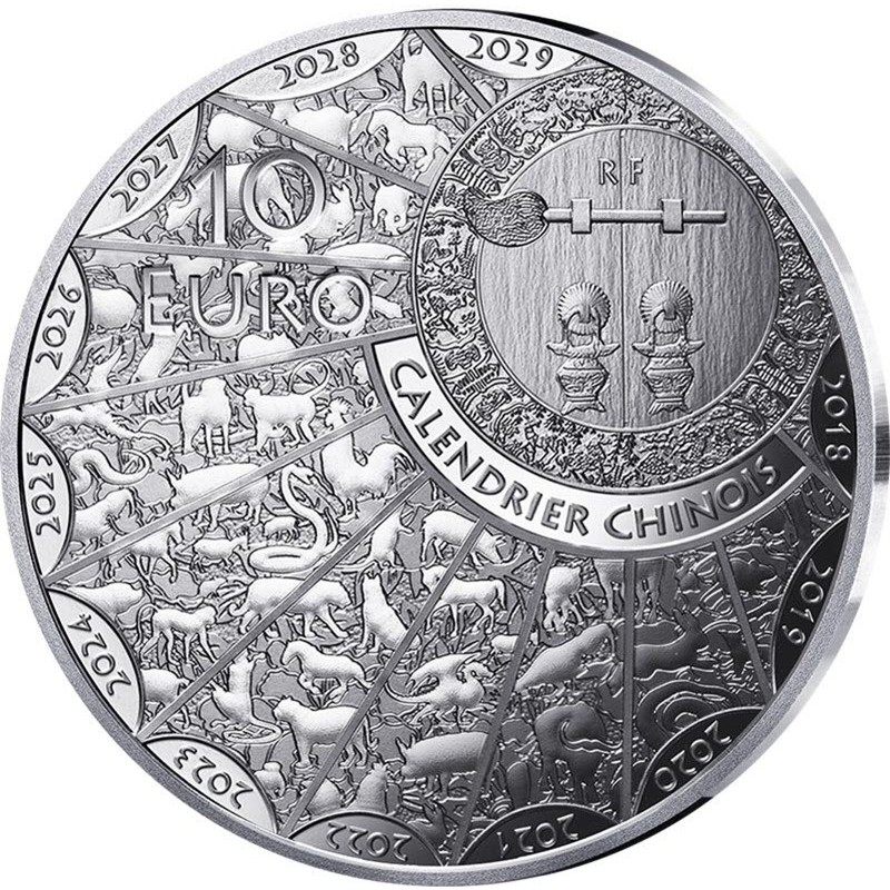 На аверсе вверху справа изображен круг, дверь храма с декоративными ручками с надписью: RF (République Française) - Французская Республика. Он окружен декоративным кольцом, под ним лента с надписью: CALENDRIER CHINOIS (Китайский календарь). Вверху слева надпись: 10 EURO (номинал). На остальной части двенадцать секторов лунного цикла с годом возле канта с изображением соответствующих животных (2018, 2019, 2020, 2021, 2022, 2023, 2024, 2025, 2026, 2027, 2028, 2029).