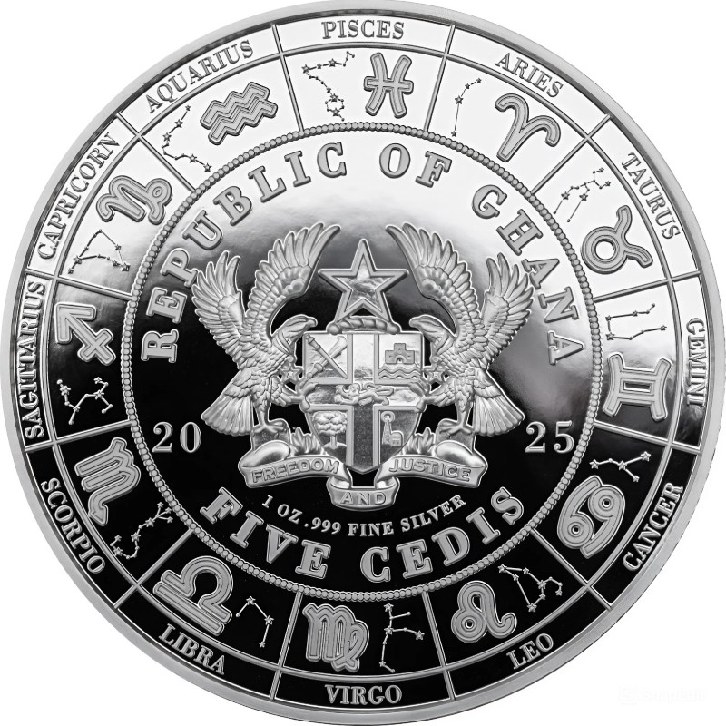 На аверсе монеты изображен государственный герб Ганы и надписи: REPUBLIC OF GHANA FIVE CEDIS 1 OZ.999 FINE SILVER 2025 (страна-эмитент, номинал, вес и проба серебра, год чеканки).