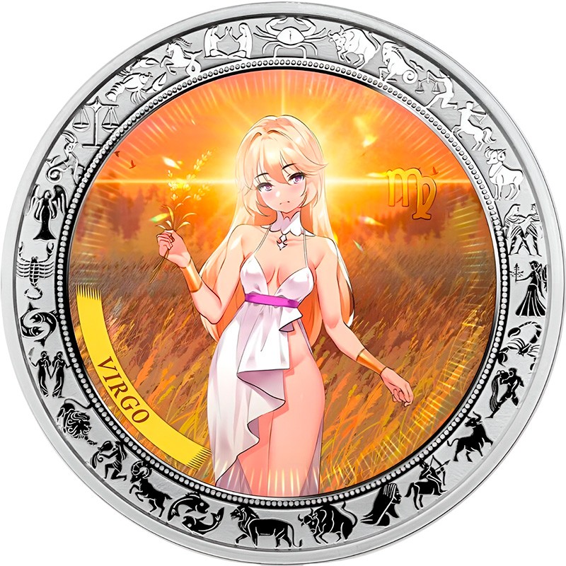 Эта красивая серебряная монета из серии “Аниме Зодиак“ посвящена шестому астрологическому знаку зодиака - “Дева” (Virgo). Считается, что к нему принадлежат рождённые с 23 августа по 23 сентября. Дева воплощает принцип порядка, победу разума над чувствами, умение видеть целое в деталях. Дева больше других знаков зодиака стремится к совершенству во всем, учится всю жизнь, но также учит и других.