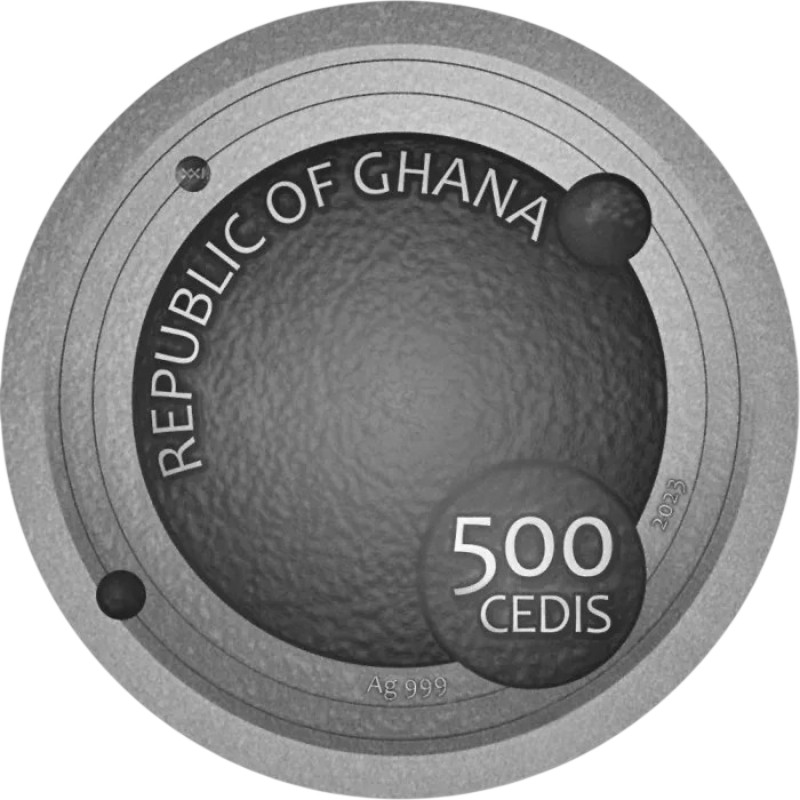 На аверсе монеты на фоне циклических сфер надписи: REPUBLIC OF GHANA 500 CEDIS Ag 999 2023 Mint XXI (страна-эмитент, номинал, проба серебра, монограмма монетного двора).