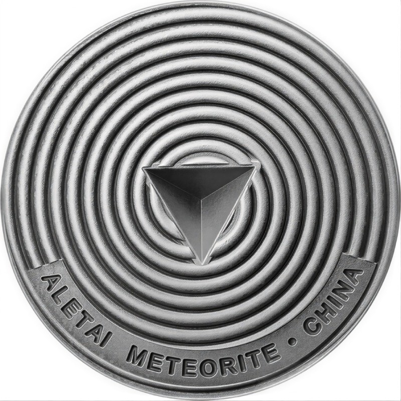 Первая часть - серебряная монета с изображением спирального дизайна с центральной прорезью для 500-граммового куба Алетая. Вдоль канта надпись: ALETAI METEORITE CHINA - название метеорита. Вторая часть монеты - удивительный куб, изготовленный из алетайского железа.