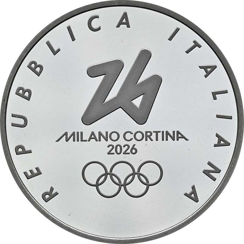 На аверсе в центре изображен  логотип XXV зимних Олимпийских игр: 26 MILANO CORTINA 2026. Вдоль канта надпись: REPUBBLICA ITALIANA (страна-эмитент).