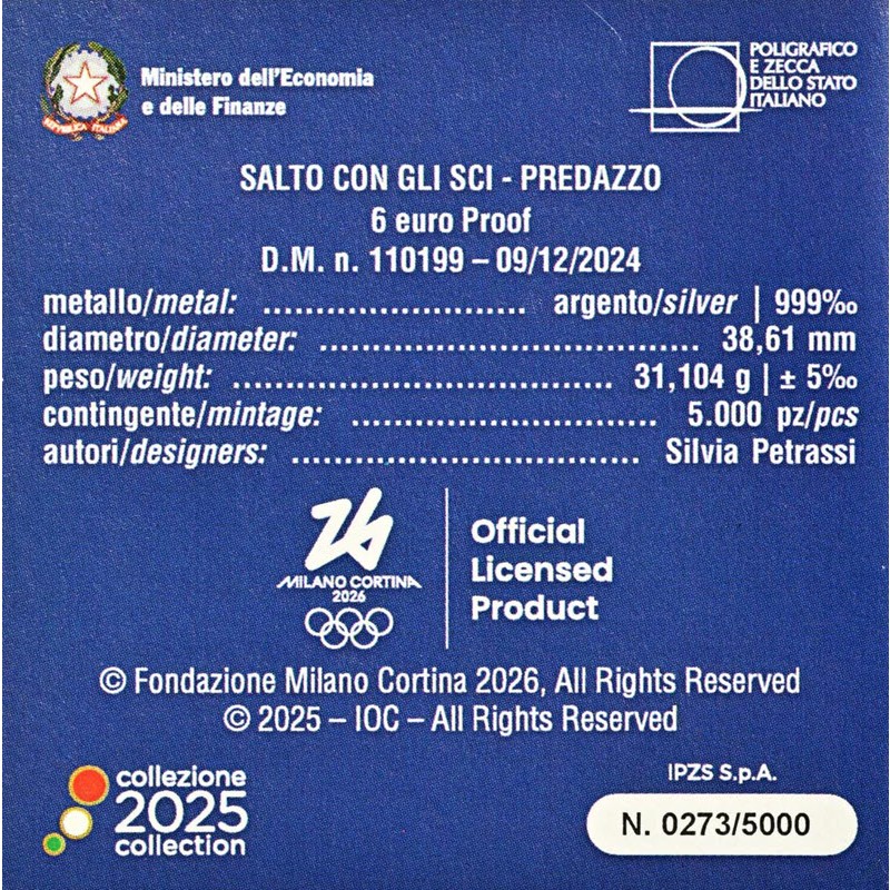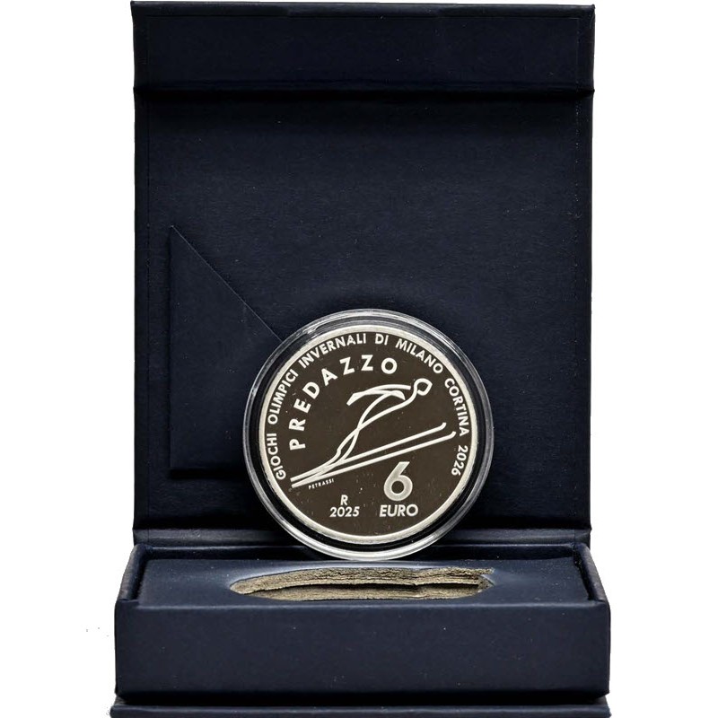 На реверсе изображена пиктограмма прыжков с трамплина. Над пиктограммой надпись: PREDAZZO (место проведения соревнований), внизу: PETRASSI R 2025 6 EURO (инициалы дизайнера Silvia Petrassi, монограмма римского монетного двора, год чеканки, номинал). Вдоль канта надпись: GIOCHI OLIMPICI INVERNALI DI MILANO CORTINA 2026 (игры).