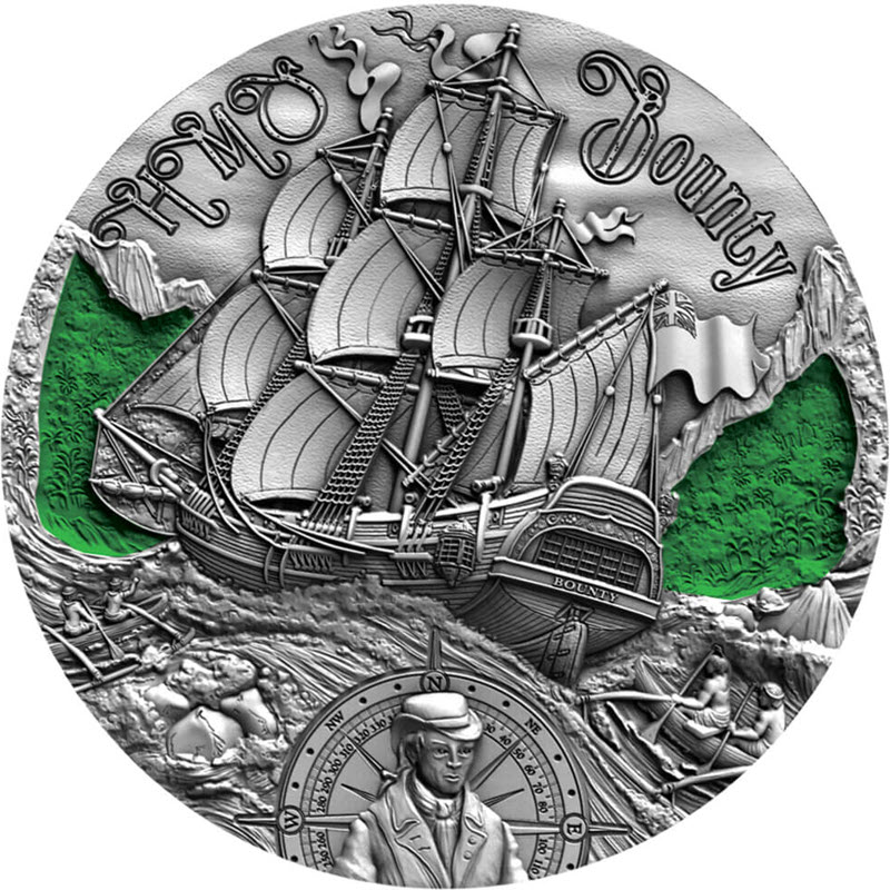 Серебряная монета из серии «Золотой век паруса», выполненная с вниманием к мельчайшим деталям. Монета поставляется в деревянном футляре, на крышке которого размещен компас.