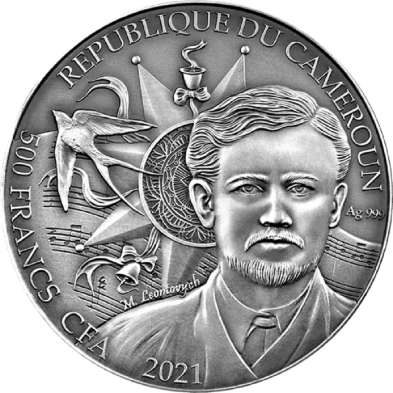 На аверсе монеты в центре изображен портрет автора гимна и его имя “М. Leontovych”. По краю монеты надписи: номинал “500 FRANCS CFA“; под ним указан год выпуска монеты “2021”;  вверху “REPUBLIQUE DU CAMEROUN“;  справа по центру “Ag 999”