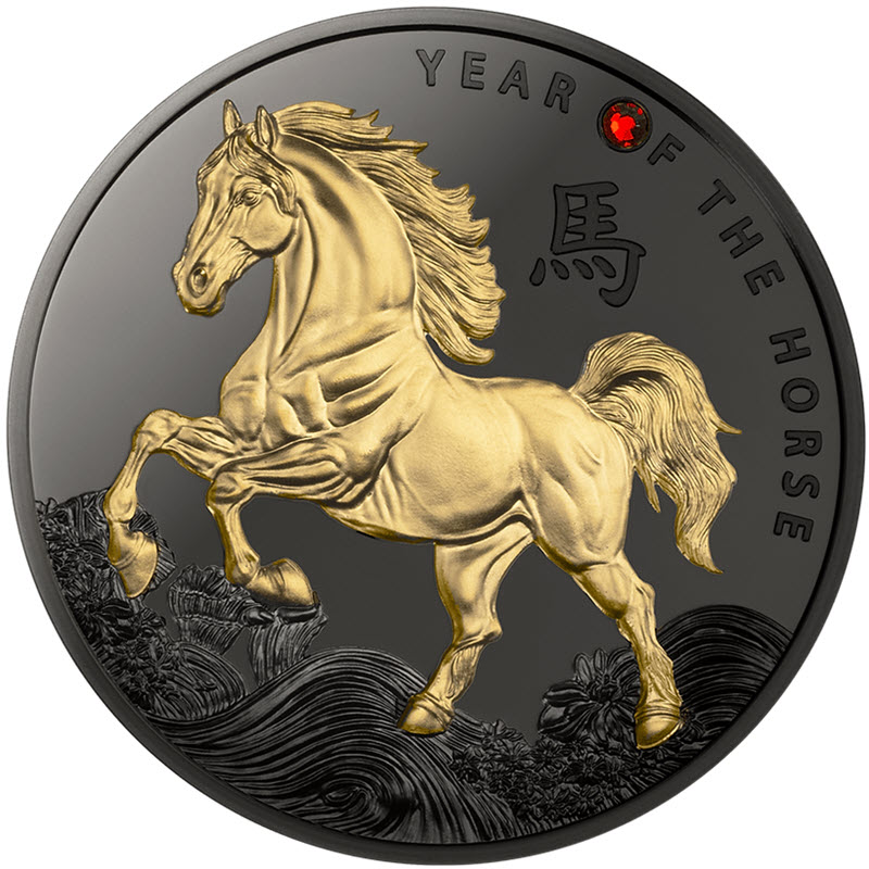 На реверсе изображена позолоченная лошадь. Над лошадью китайский иероглиф: 馬 (Лошадь). Вверху надпись с вставкой красного кристалла: YEAR OF THE HORSE.