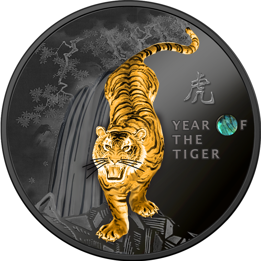 Эта серебряная монета посвящена тем, кто родился в китайский лунный год Тигра. У монеты качество Proof, она полностью покрыта рутением и украшена изумрудным кристаллом в качестве вставки. Он поставляется в футляре вместе с сертификатом подлинности. Ограниченный тираж до 999 штук по всему миру.