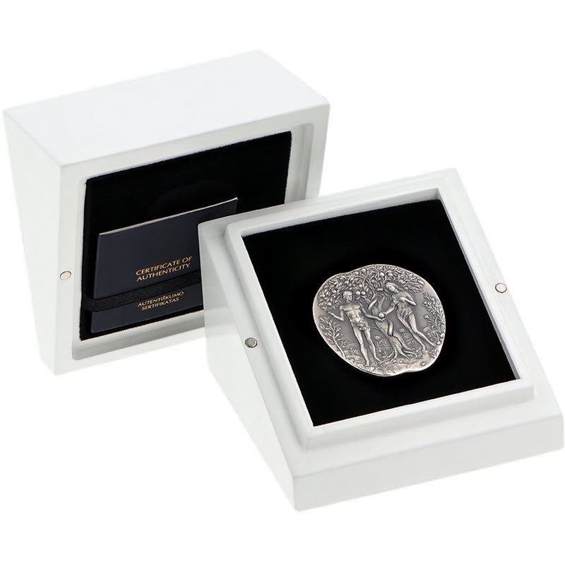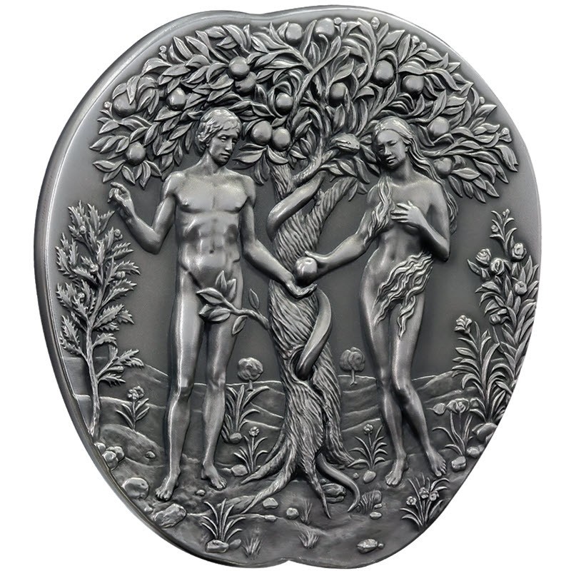 Эта удивительная серебряная монета весом в 260 грамм от Литовского монетного двора в форме яблока посвящена грехопадению Адама и Евы. Дизайн Мирослава Хрича (Miroslav Hric). У нее размер 40.4 Х 48.2 Х 20.2 мм, качество античной отделки и высокий рельеф. Поставляется в оригинальном футляре с сертификатом подлинности. Тираж: 100 штук.