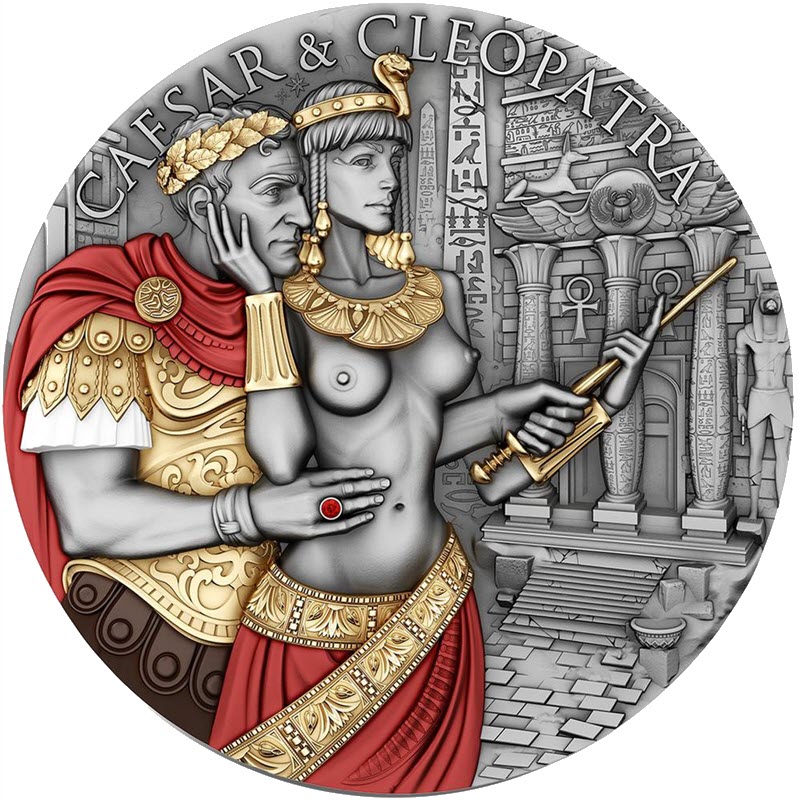 Эта удивительная серебряная монета весом в 2 унции – первая из серии «Сила любви» от литовского монетного двора T&S Coin, посвящена Цезарю и Клеопатре. У нее качество античной отделки, вставка из рубина, высокий рельеф и выборочное золочение. Поставляется в оригинальном футляре с сертификатом подлинности. Тираж: 500 штук.