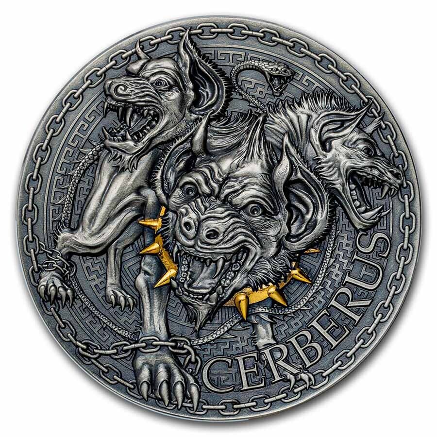 На реверсе монеты представлено невероятно детальное изображение Цербера, стража подземного мира, с цепью вокруг, которую пытается удержать трехголовый пес преисподней, выборочной позолотой шипованного ошейника, и змеями вместо меха. В нижней части реверса надпись: "CERBERUS" - название монеты.