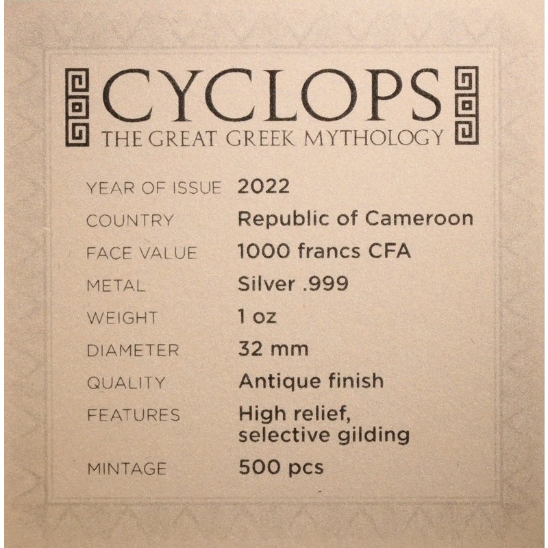 Серебряная монета Камеруна "Великая Греческая мифология: Циклоп" 2022 г.в., 31.1 г чистого серебра (Проба 999)