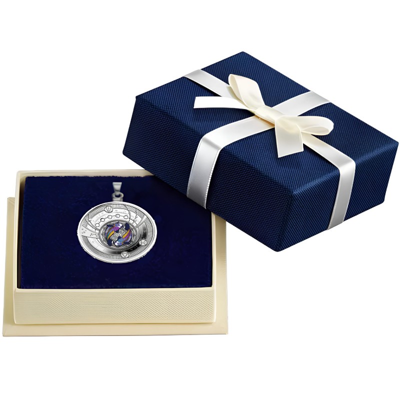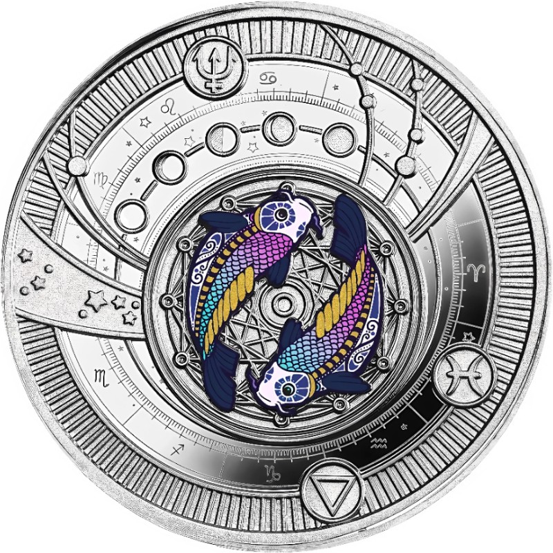 Эта потрясающая серебряная монета-подвеска на шнурке посвящена двенадцатому астрологическому знаку зодиака - “Рыбы” (Pisces). Считается, что к нему принадлежат рождённые с 21 февраля по 20 марта. Многие считают его представителей непредсказуемыми и загадочными натурами, а астрология приписывает им зачастую противоречивые качества.